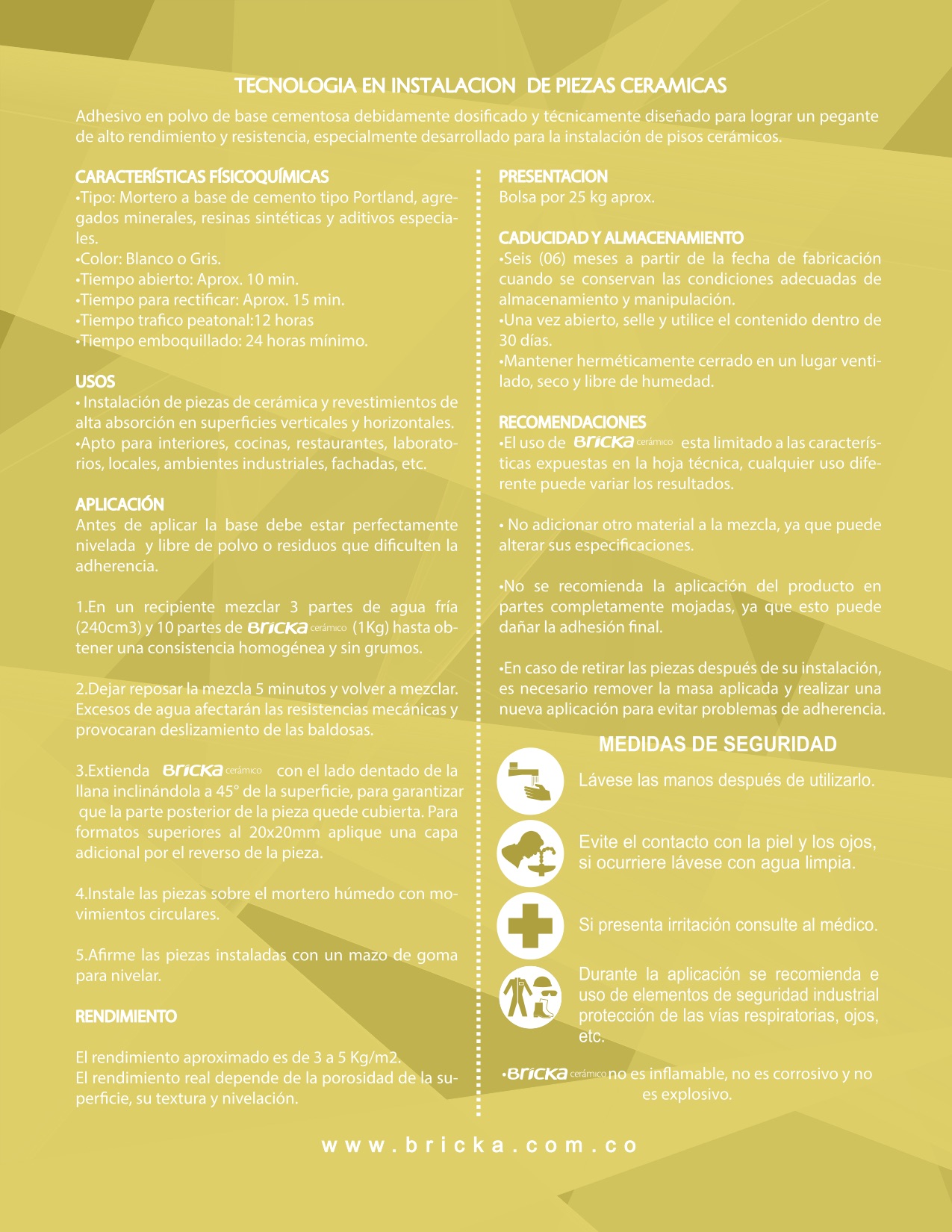 Adhesivo en polvo de base cementosa debidamente dosificado y técnicamente diseñado para lograr un pegante de alto rendimiento y resistencia, especialmente desorrado para la instalación de pisos cerámicos.